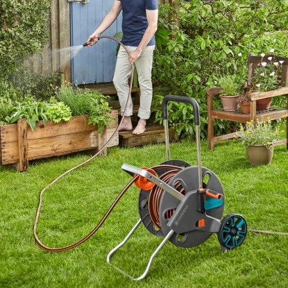 Der Gardena Schlauchwagen Aqua Roll L Easy erleichtert das Bewässern des Gartens. Dank der Schlauchtrommel ist der Gartenschlauch sofort einsatzbereit und nach der Bewässerung schnell und ohne zu verknoten verwahrt.